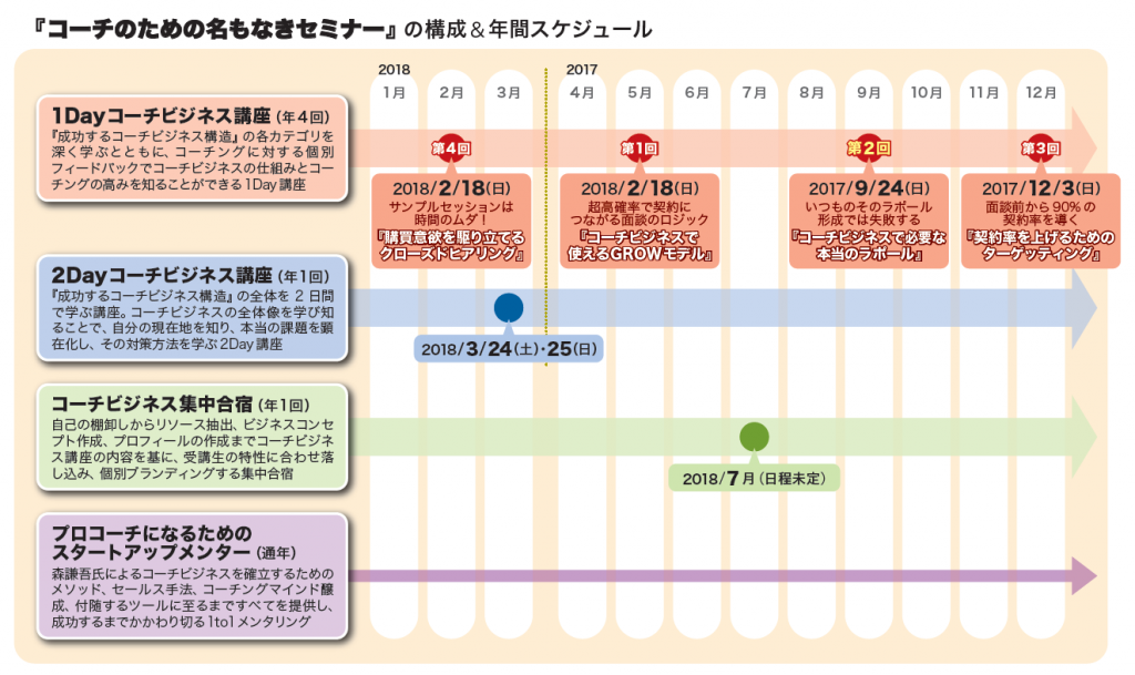 | コーチビジネス集中合宿 | 自己の棚卸し・リソース抽出を基に、受講生の特性に合わせ個別ブランディングし、ビジネスコンセプト作成、顧客獲得戦略の策定、行動計画やプロフィールへの落とし込みまでを行う集中合宿 |